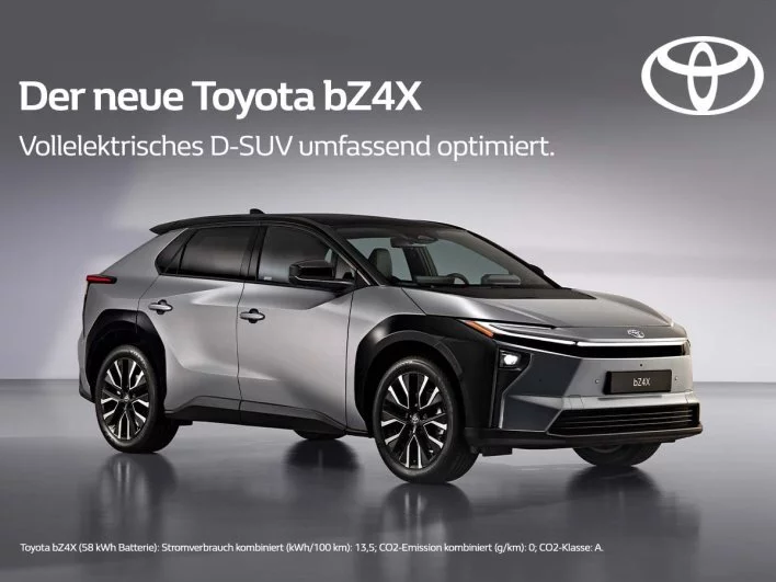 neuen Toyota bZ4X. Wir beraten Sie gerne zu den verschiedenen Ausstattungen und den attraktiven Leasing- und Finanzierungsoptionen. Machen Sie den nächsten Schritt in Richtung elektrische Zukunft!