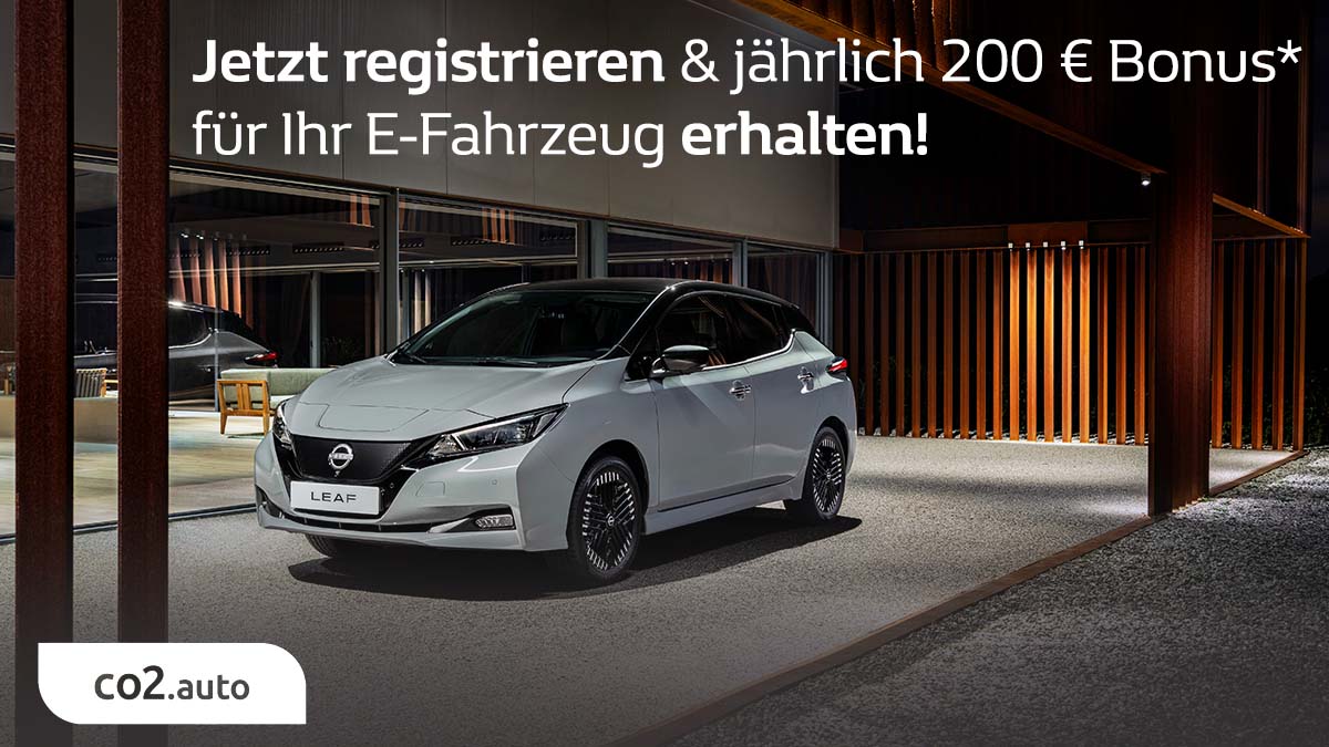 Jetzt unter co2.auto registrieren und jährlich CO2 Bonus für Ihr E-Fahrzeug erhalten!