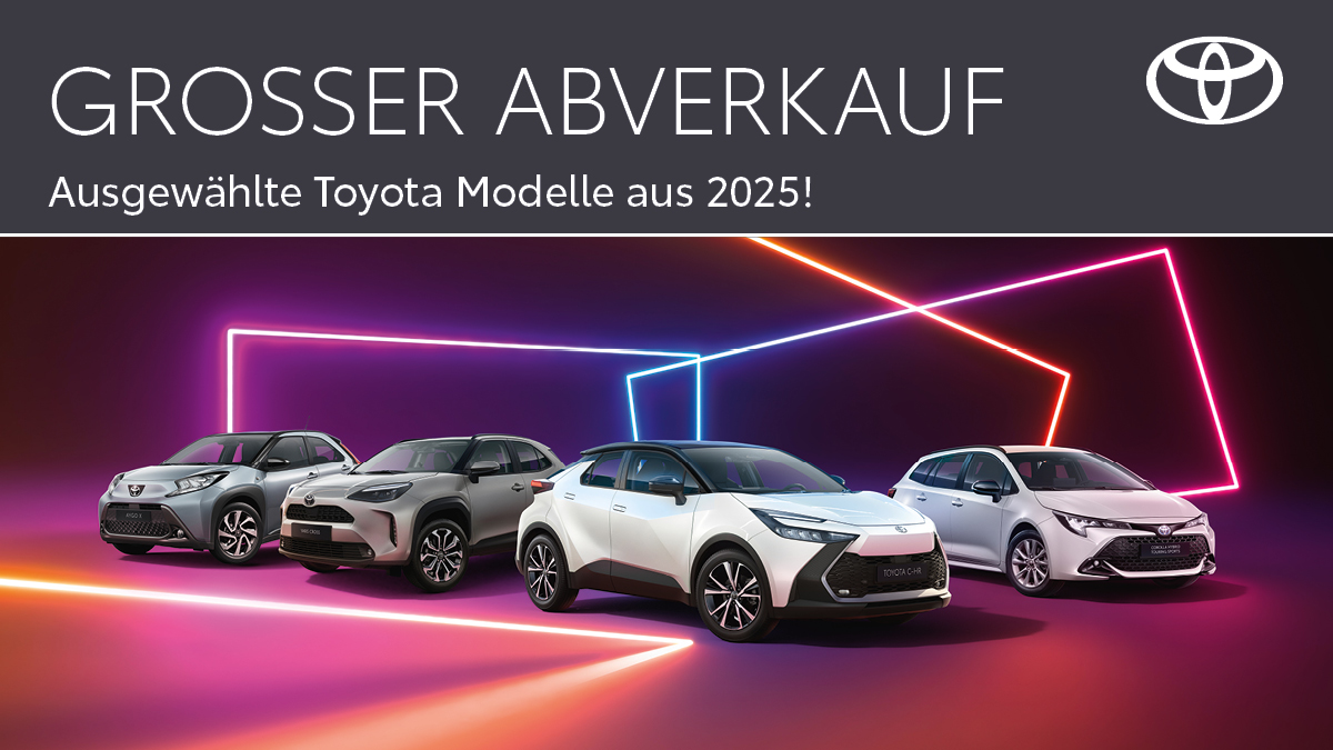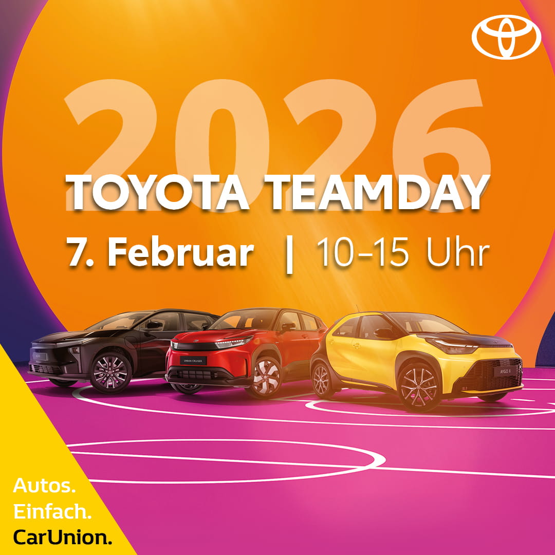 *Bei Kauf eines Aktionsfahrzeuges zahlen wir für Ihren Gebrauchten 1.000 € mehr als er bei Schwacke/DAT wert ist. Das Fahrzeug muss 3 Monate auf Sie zugelassen sein und darf max. 12 Jahre alt sein. NUR gütlig am 7.2.2026. | Die Höhe der Deutschlandprämie ist modellabhängig. Nur gültig bei Abschluss eines Leasingvertrages mit der Toyota Kreditbank GmbH mit einer Laufzeit von 48 Monaten. Prämie wird als Nachlass auf die UVP gewährt und reduziert die mtl. Leasingrate. Nur gültig für Privatkunden bis zum 31.3.2026. | Teilnahme am Gewinnspiel bis zum 11.2.2026. Gewinnspielveranstalter ist Toyota Deutschland GmbH. Teilnahmeberechtigt sind Personen mit Wohnsitz in Deutschland, die das 18. Lebensjahr vollendet haben. Gewinner werden per Los ermittelt. Die vollständigen Teilnahmebedingungen finden Sie unter Toyota.de/Toyota-Teamday. | Service-Angebote sind nur bei Terminvereinbarung am 7.2.2026 gültig.